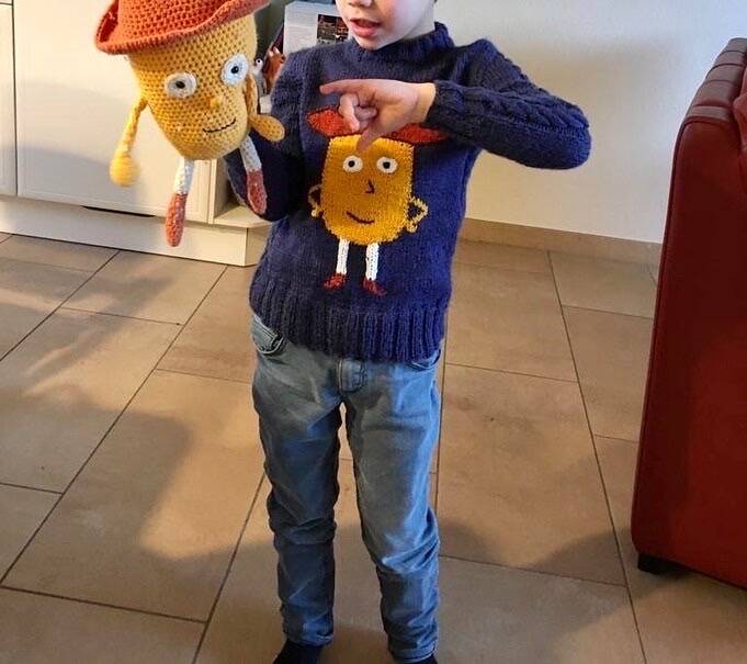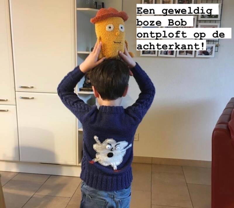 Superbreier Lenny Blesgraaf, de talentvolle oma van een Bob Popcorn fan, maakte een prachtige trui met een blije Bob voorop en een boze Bob op de achterkant.