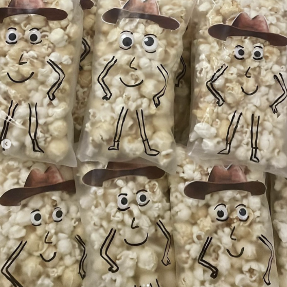 Heel creatief! Teken Bob op een plastic zakje met popcorn. Geef hem een hoedje en oogjes. Het hoedje kun je knippen uit het plaatje, hiernaast te downloaden.