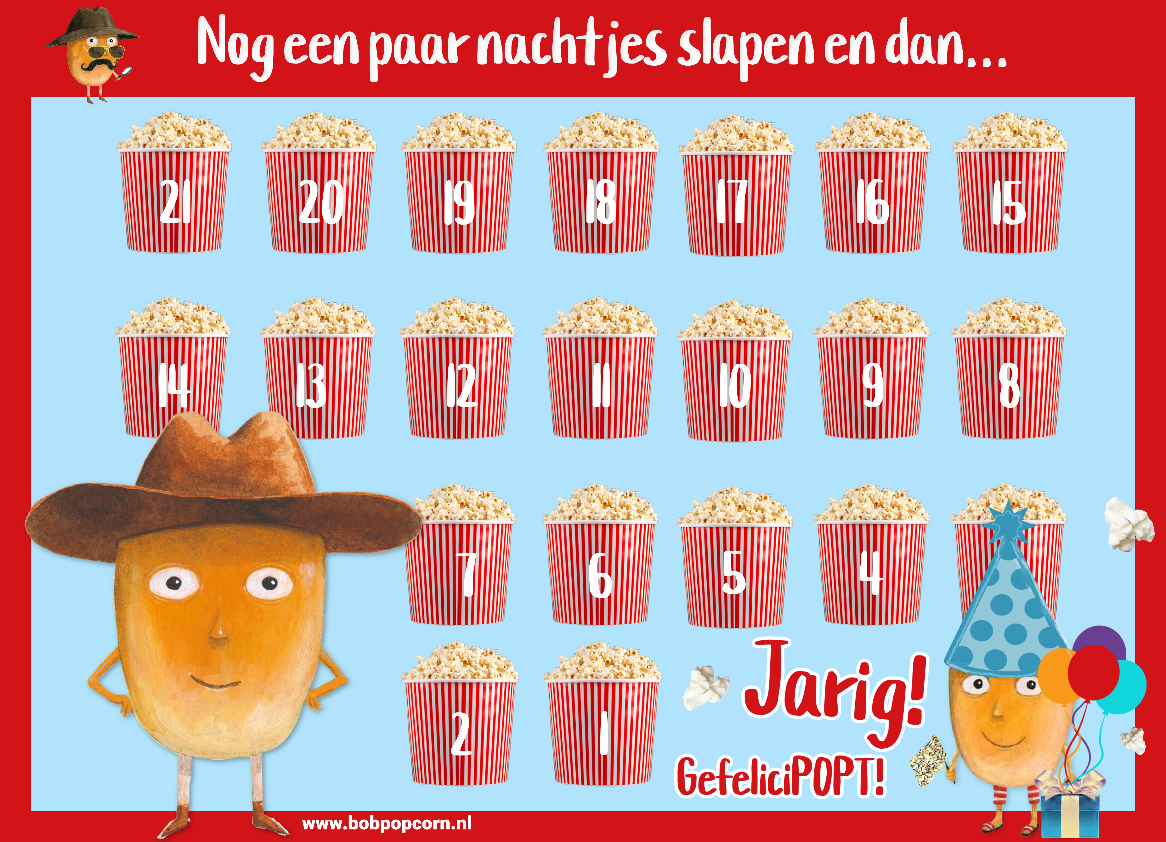 Ben je over een paar weekjes jarig en kun je bijna niet wachten? Hang dan de Bob Popcorn aftelkalender op in je kamer. Elke avond kruis je een beker popcorn door en voor je het weet is het zover.... en ben je JARIG!