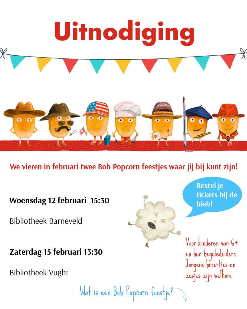 De komende maanden gaan we naar flink wat scholen en bibliotheken om leesplezier te vieren met kinderen van groepen 3 t/m 6. Misschien komen we ook langs bij jou! Als dat nou niet zo is... geen probleem! We geven in februari ook twee openbare Bob Popcorn feestjes voor iedereen van 6 jaar of ouder. Neem begeleiding mee - en een jonger broertje of zusje is ook welkom. Bestel je tickets op tijd!
