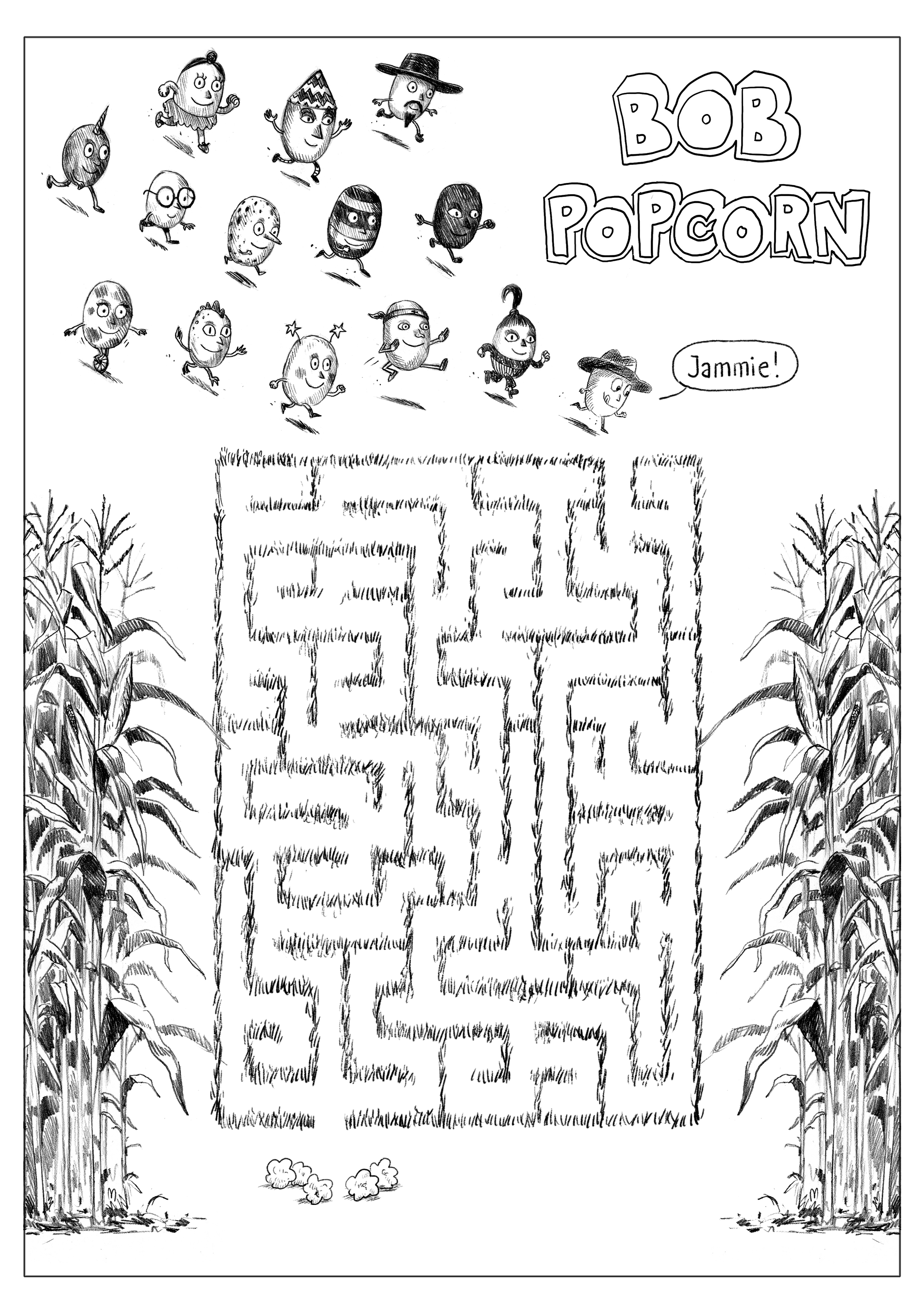 Bob Popcorn en zijn familie hebben zin in popcorn. Help jij ze de weg te vinden? En kleur je alles ook even mooi in? Veel plezier!